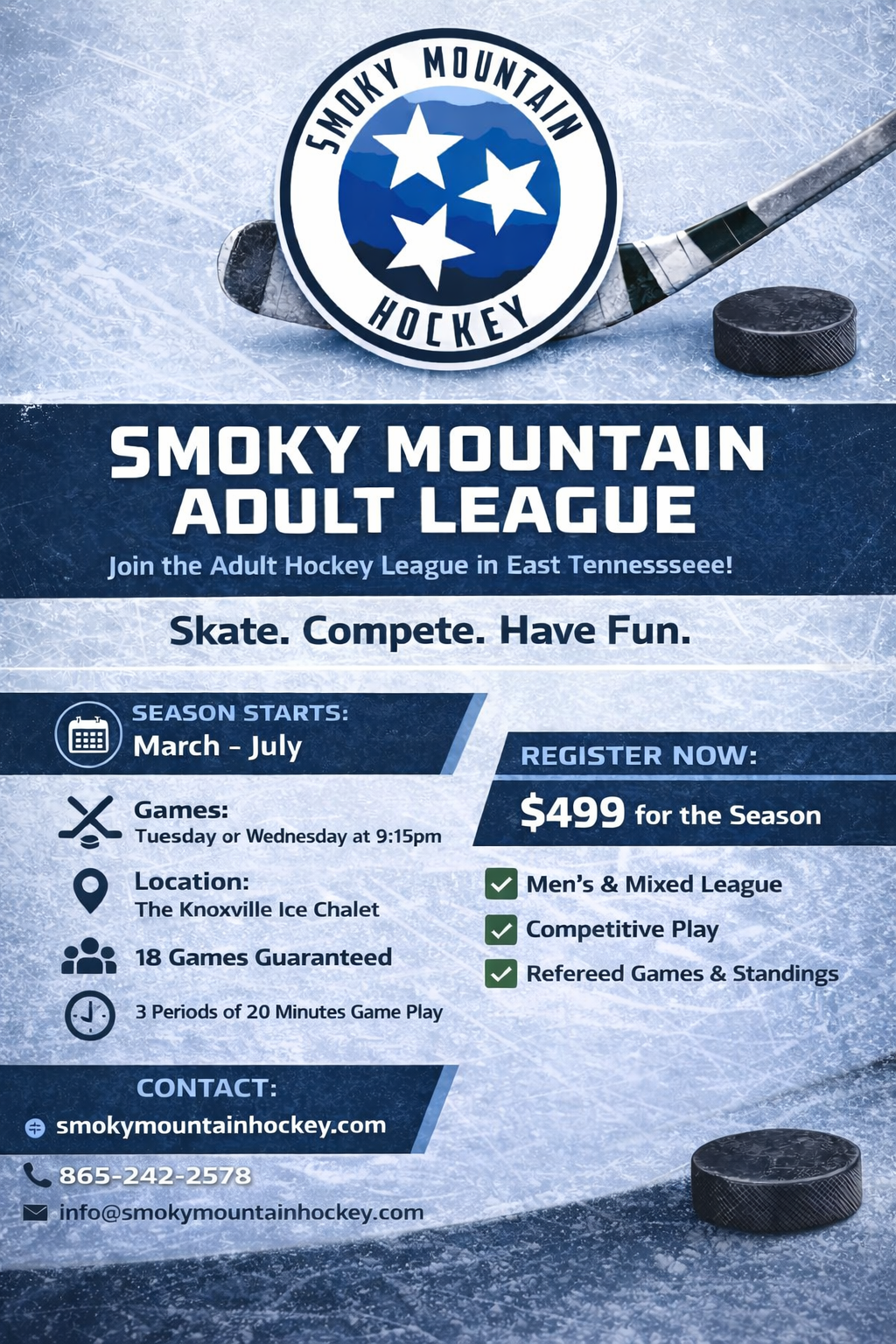 The Smoky Mountain Hockey League is a mixed-level adult league built for competitive, fast-paced, and balanced hockey all summer long. This league brings together high-level, mid-level, and developing players into one competitive division designed to create parity, strong team chemistry, and a great locker room atmosphere.